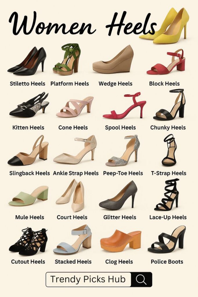 Heels are known for their elegant and stylish look. They make women look taller and more confident. Heels are mostly worn at parties, weddings, and formal events. There are different types like high heels, block heels, wedges, and kitten heels. Block heels are more comfortable compared to thin heels, making them a good choice for long hours.